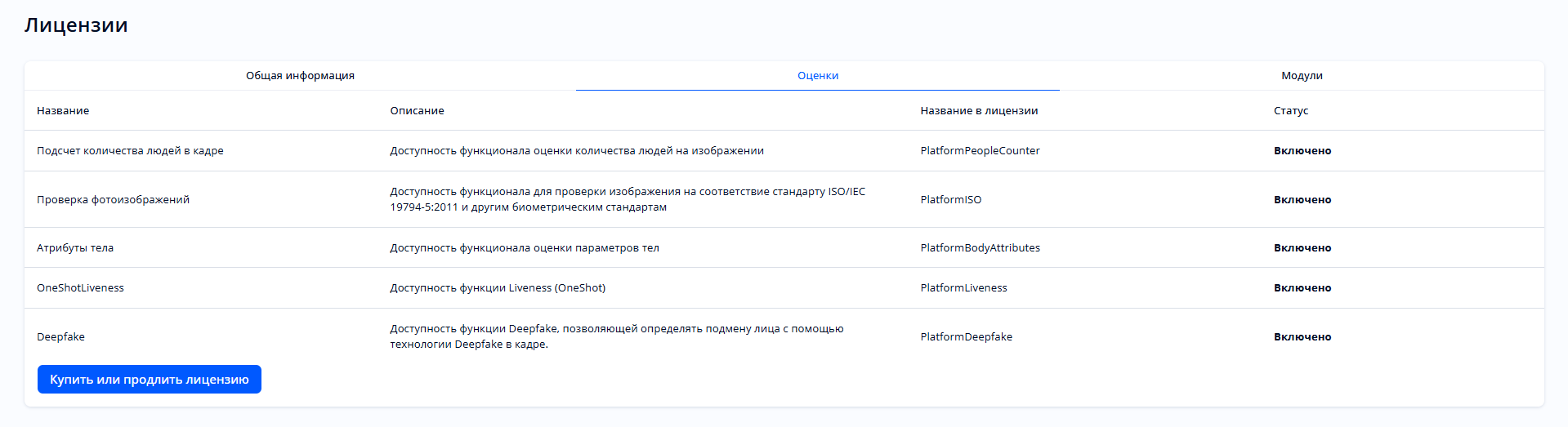 Раздел «Лицензии» предназначен для получения информации о доступных лицензиях.