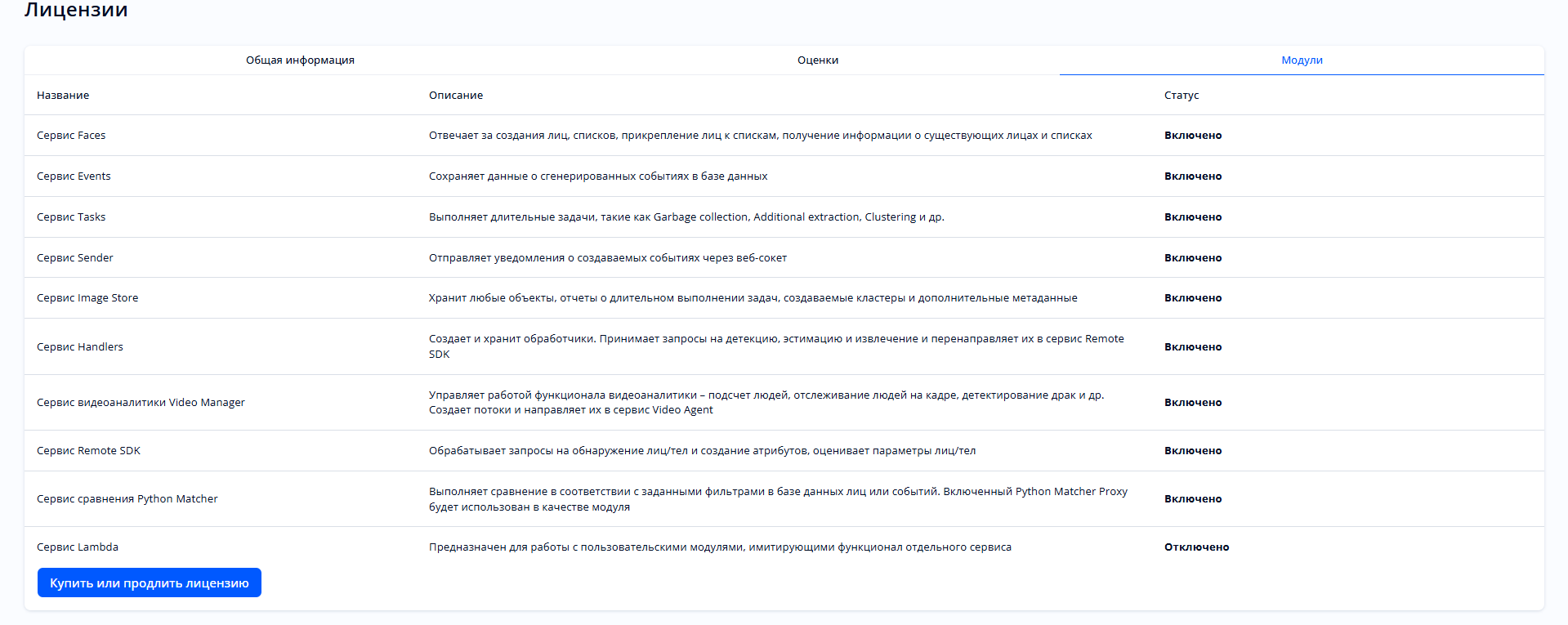 «Модули» — отображает статус (включено/выключено) лицензий сервисов для (Рисунок 121):