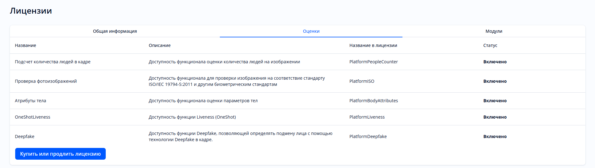 «Оценки» — отображает статус (включено/выключено) лицензий для (Рисунок 89):