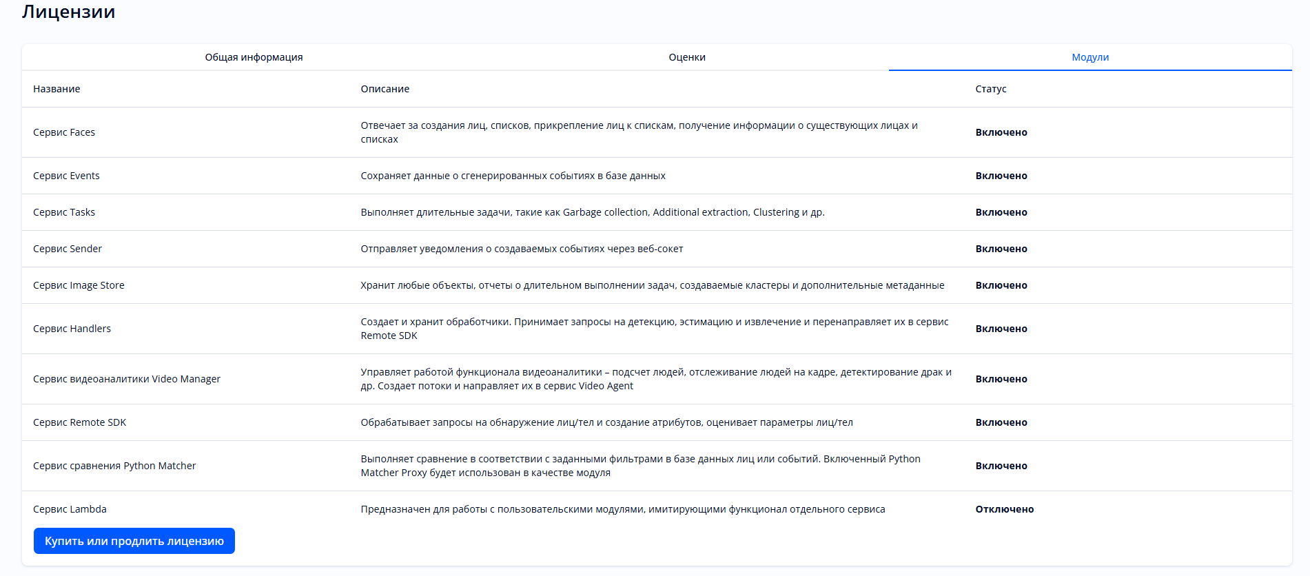 «Модули» — отображает статус (включено/выключено) лицензий сервисов для (Рисунок 90):